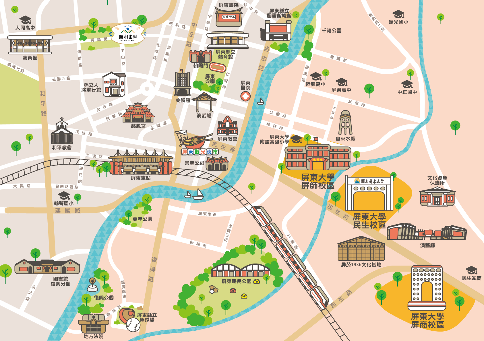 說明:本校共有4個校區,民生校區、屏師校區、屏商校區,皆位於屏東市區內,交通便捷,距屏東市中心火車站約三公里。車城校區位於屏東縣車城鄉。